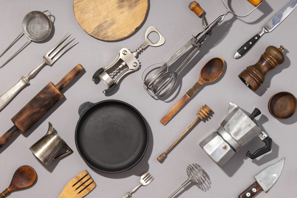 أدوات المطبخ: أواني طهي، مقالي، قدور ضغط، أطقم ملاعق وسكاكين، حافظات طعام، وغيرها.